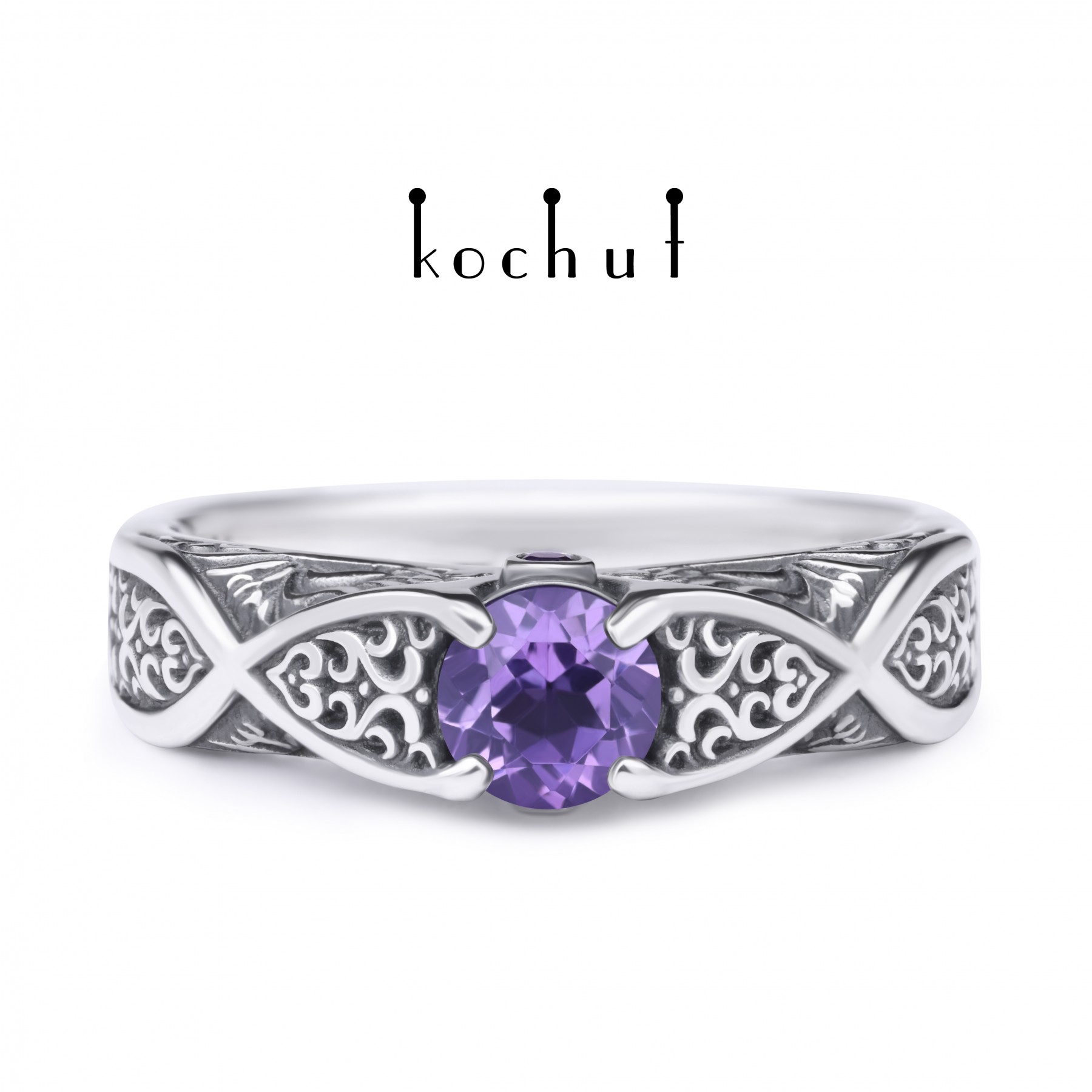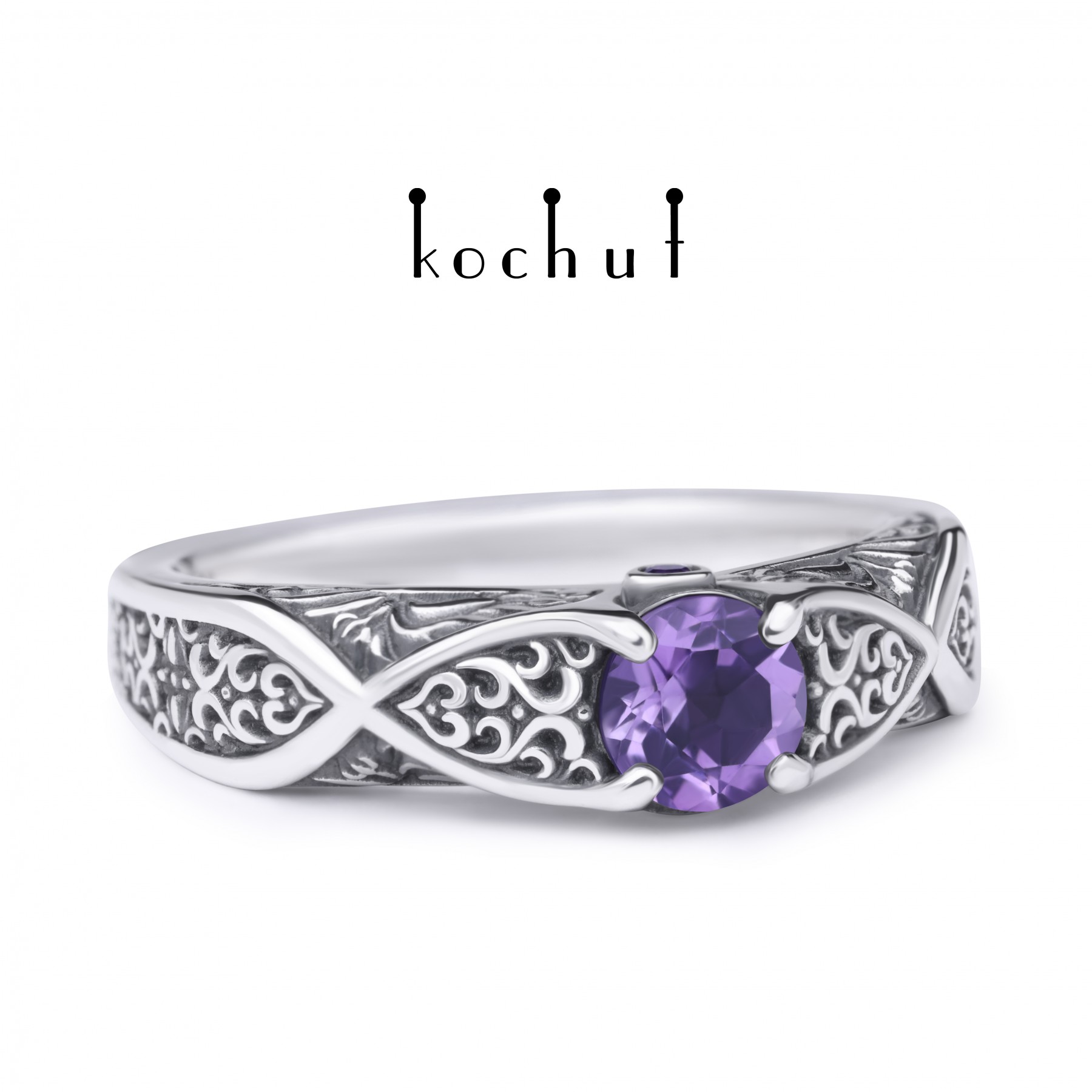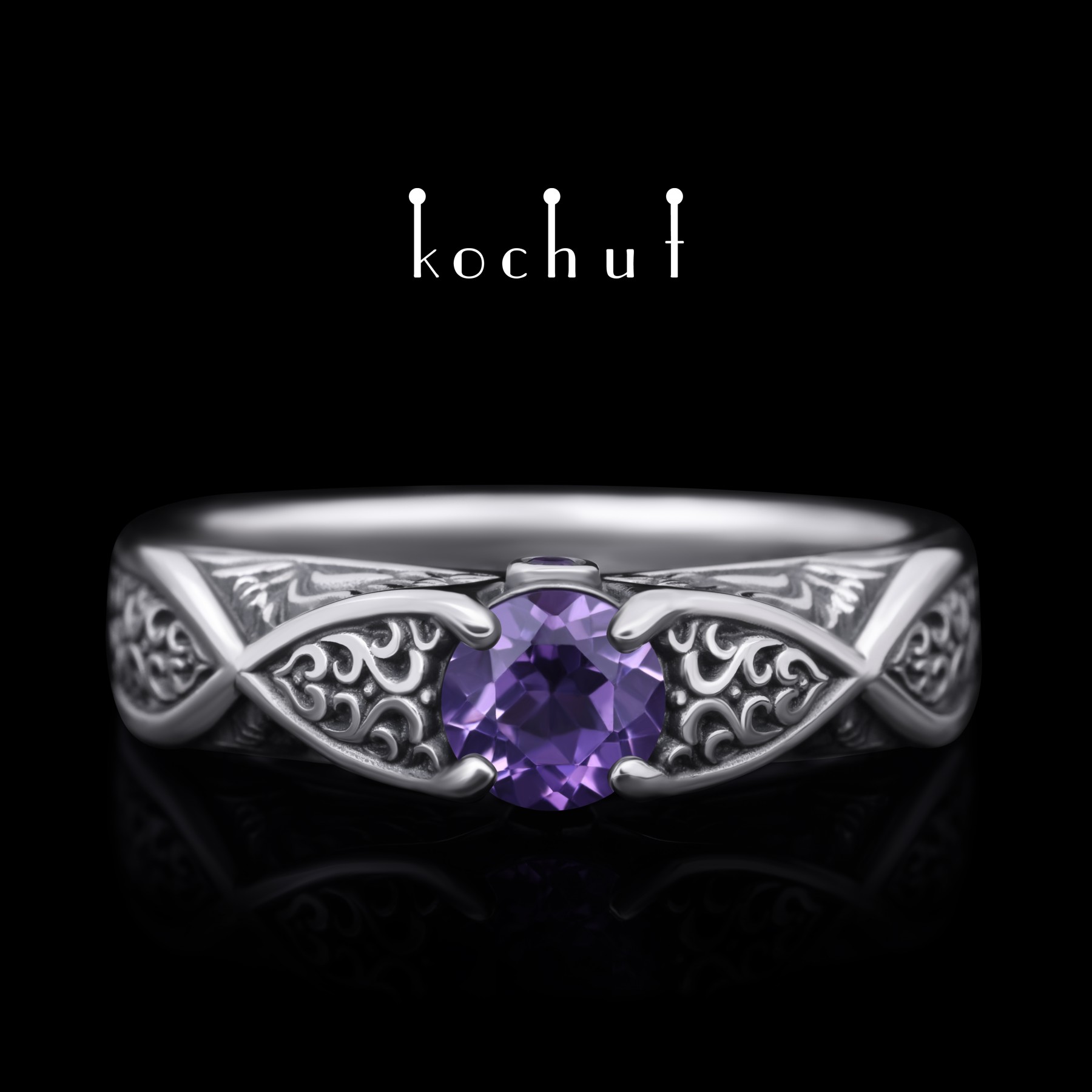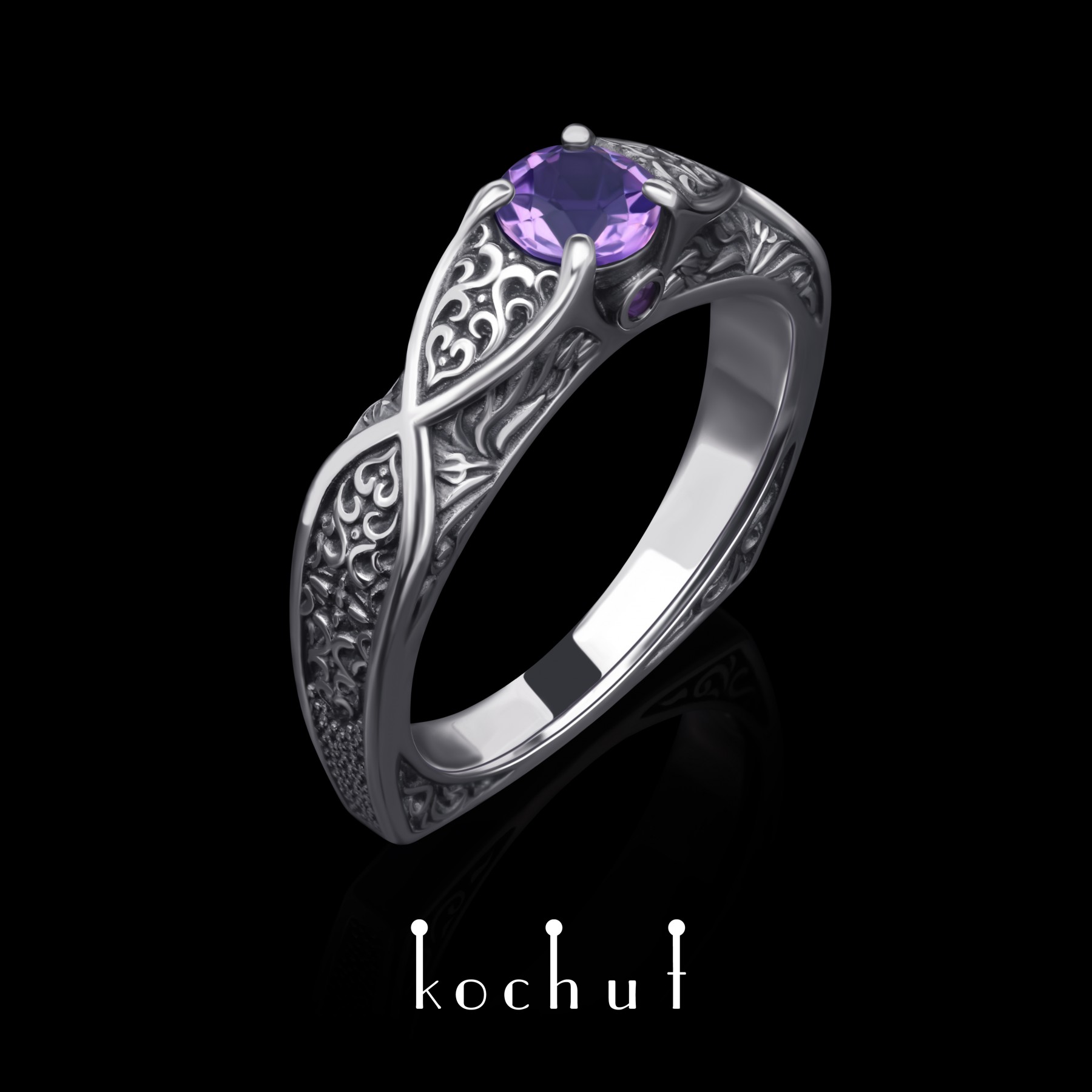 Prsten je vyrobený z oxidovaného stříbra. Přírodní kámen, úžasný ametyst, představuje Versailles v bohatých zelených zahradách.